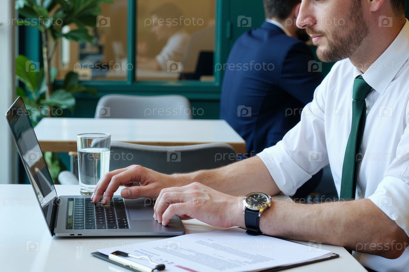 Взрослый мужчина работает на ноутбуке с документами в современном офисе