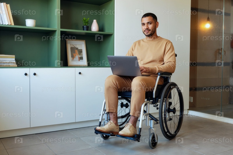 Портрет взрослого мужчины с инвалидностью, работающего на ноутбуке в офисе