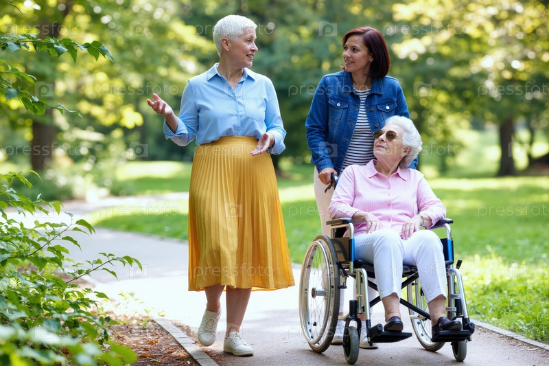 Женщина с инвалидностью наслаждается прогулкой в парке со своими семьями, опекунами пожилых людей