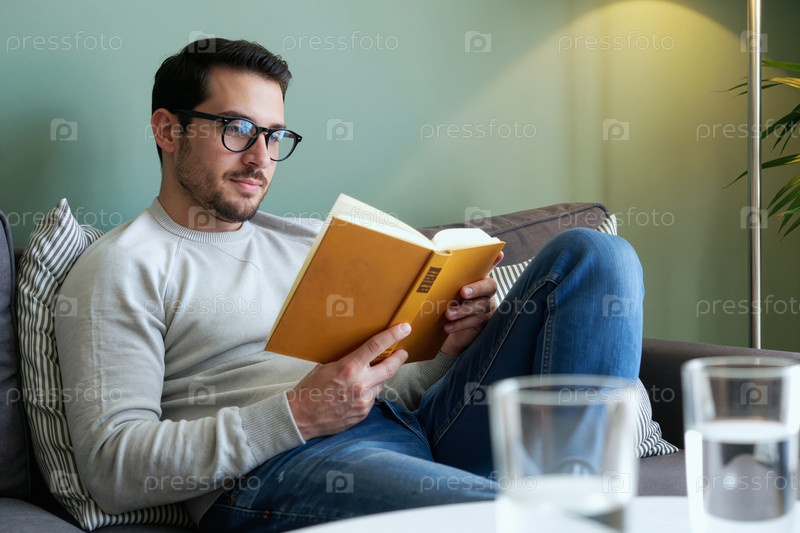 Взрослый мужчина читает книгу дома для отдыха и досуга