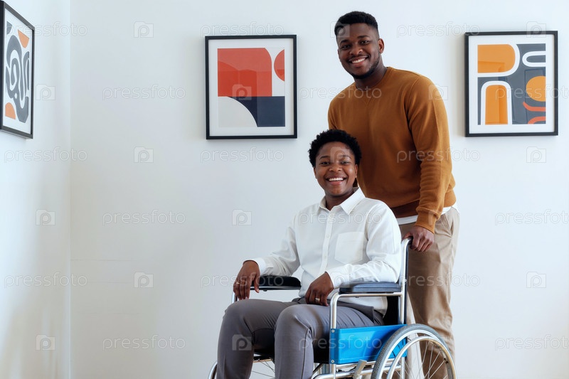 Портрет чернокожей женщины с инвалидностью со своим улыбающимся другом в помещении