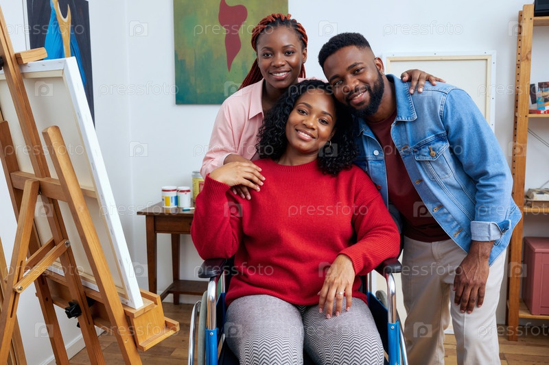 Портрет чернокожей семьи с инвалидностью, позирующей в художественной студии