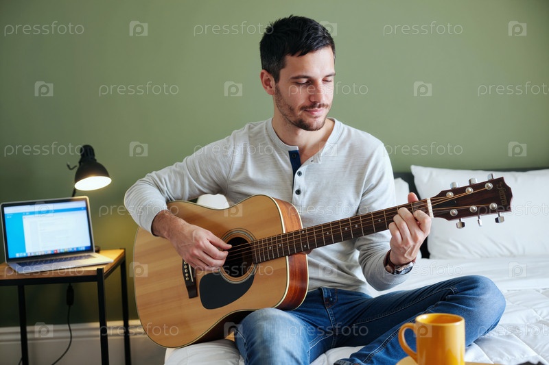 Взрослый мужчина играет на акустической гитаре во время расслабляющего домашнего отдыха