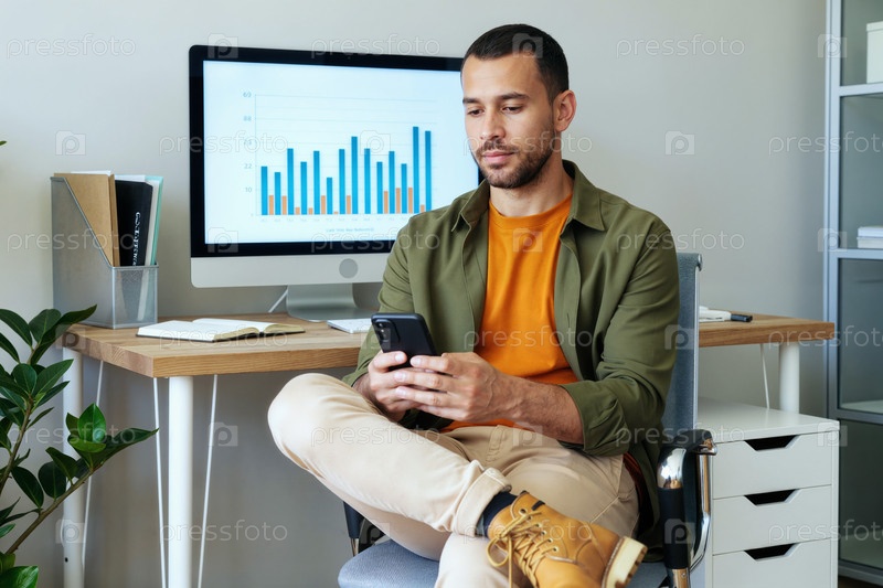 Взрослый мужчина проверяет смартфон во время домашней рабочей сессии