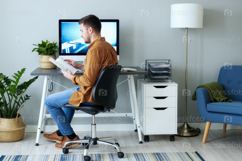 Взрослый мужчина читает блокнот в домашнем офисе для удаленной работы