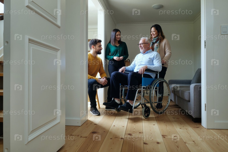Мужчина-старший с инвалидностью, встречающийся со своей семьей.Опекуны дома