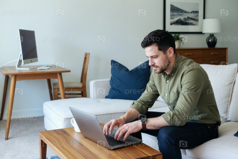 Взрослый мужчина работает на ноутбуке из дома для удаленного бизнеса