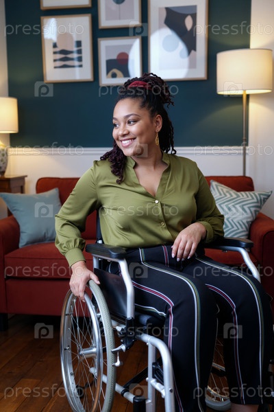 Чёрная взрослая женщина с инвалидностью улыбается в инвалидном кресле дома