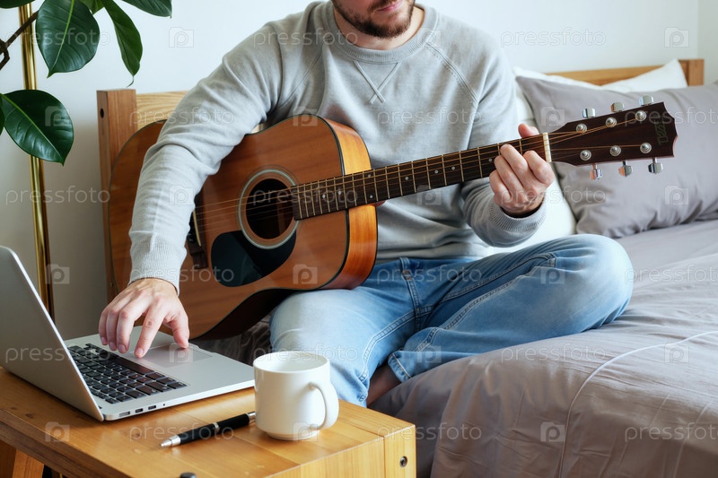 Мужчина играет на гитаре и использует ноутбук для онлайн-урока музыки