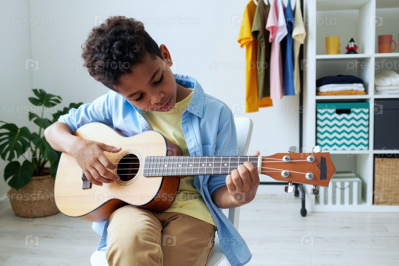 Молодой чернокожий мальчик играет на акустической гитаре в помещении во время свободного времени