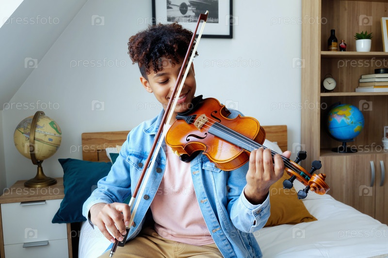Чернокожий подросток играет на скрипке, сидя на кровати в современной спальне