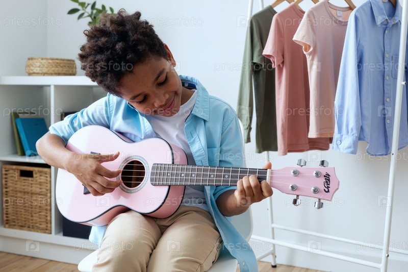 Улыбающийся чернокожий мальчик играет на акустической гитаре в помещении во время досуга