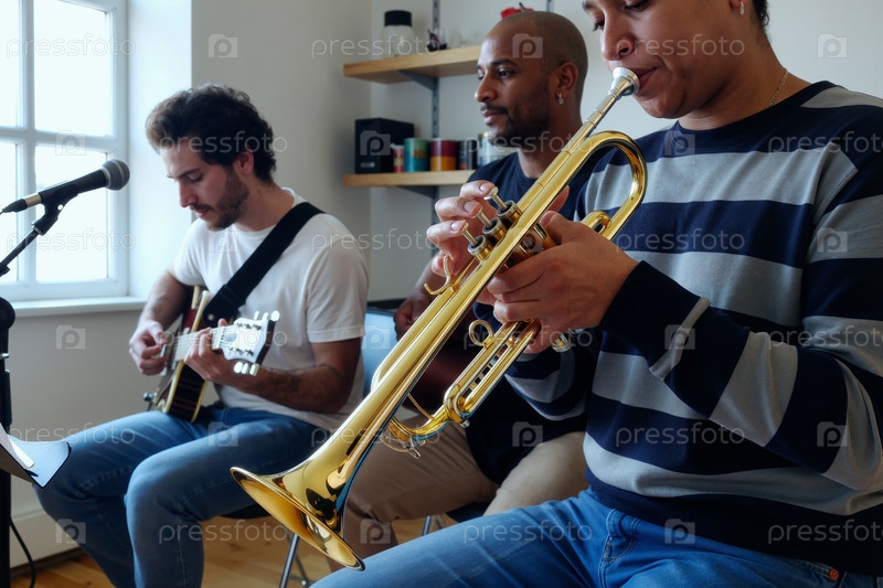 Мультиэтнические молодые взрослые мужчины играют на гитаре, трубе и поют в музыкальной студии