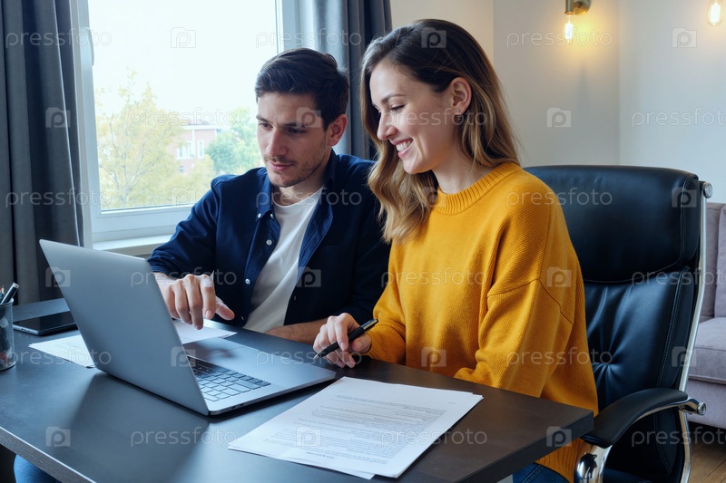 Молодой белый мужчина и женщина просматривают документы вместе, используя ноутбук