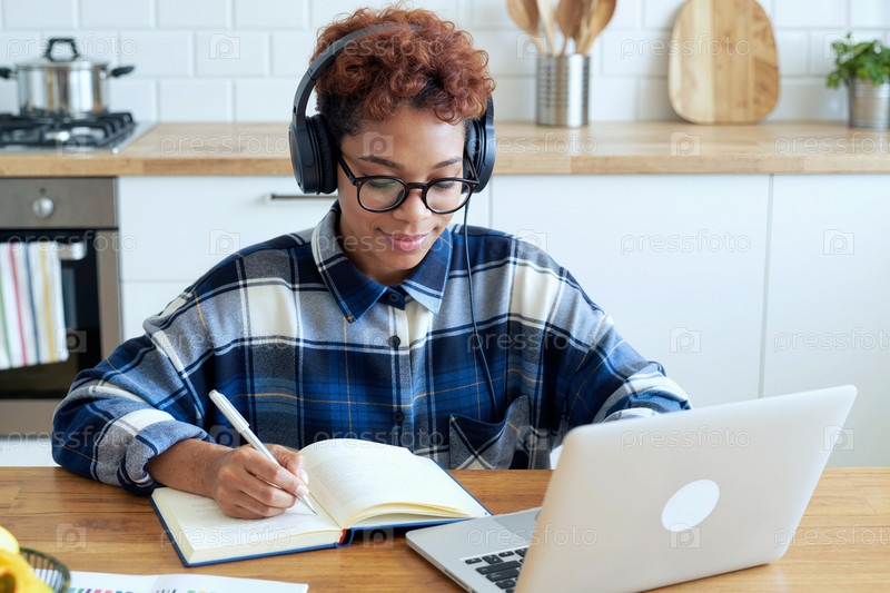 Молодая взрослая чернокожая женщина учится в Интернете, делая заметки на кухне