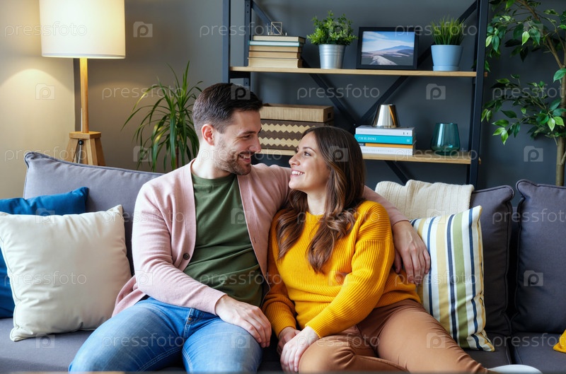 Кавказская молодая взрослая пара сидит на диване, улыбается и смотрит друг на друга