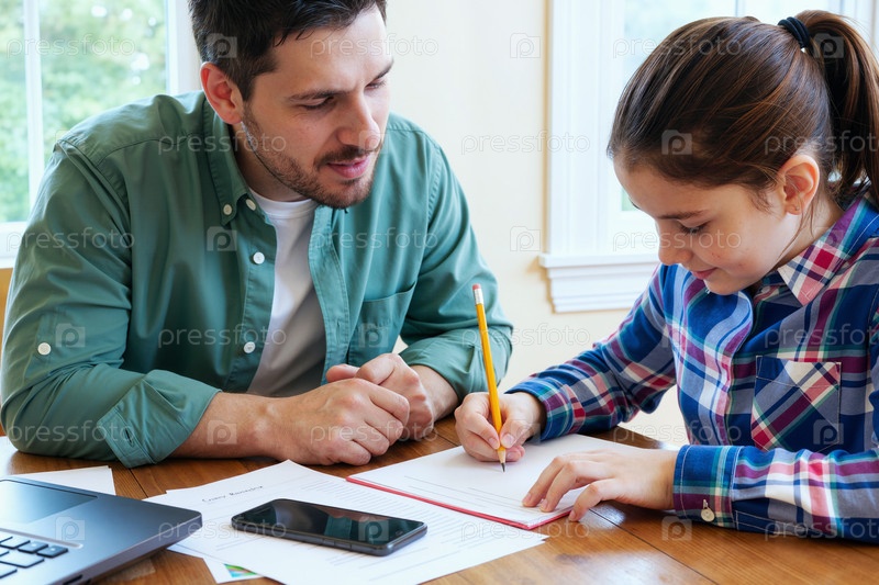 Белый молодой взрослый мужчина помогает белой девушке делать домашнее задание за столом