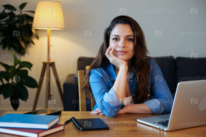 Портрет молодой взрослой белокожей женщины, сидящей за рабочим столом и использующей ноутбук