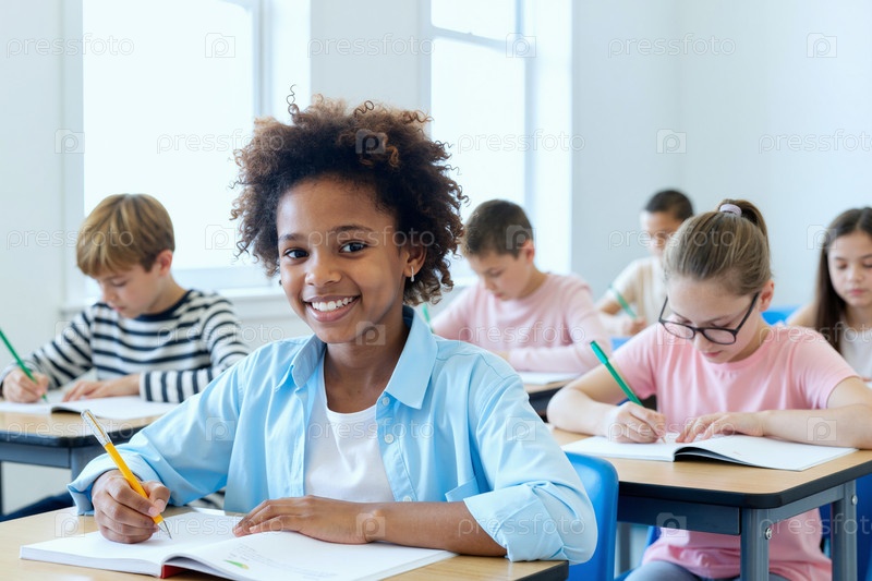 Портрет молодой чернокожей девушки, улыбающейся во время учебы в классе со сверстниками