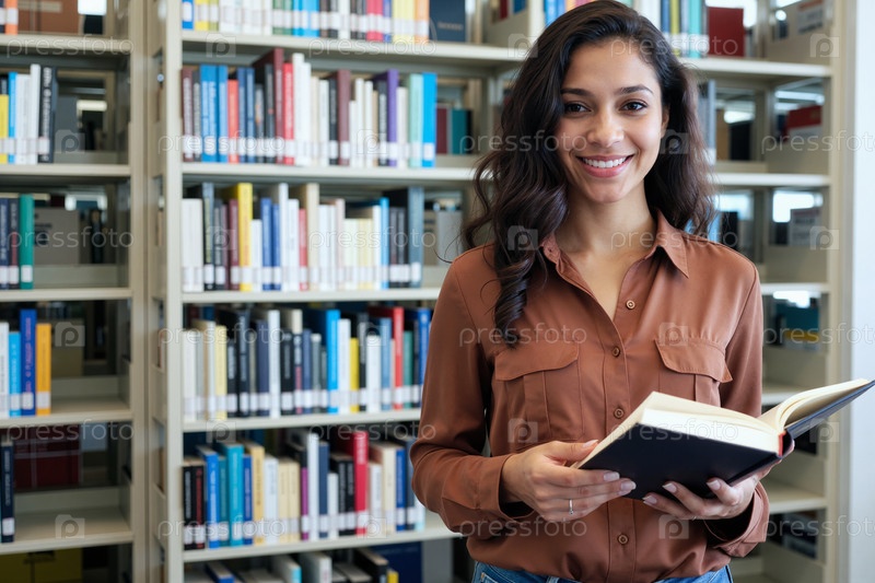 Портрет молодой взрослой испаноязычной женщины, улыбающейся во время чтения книги в библиотеке
