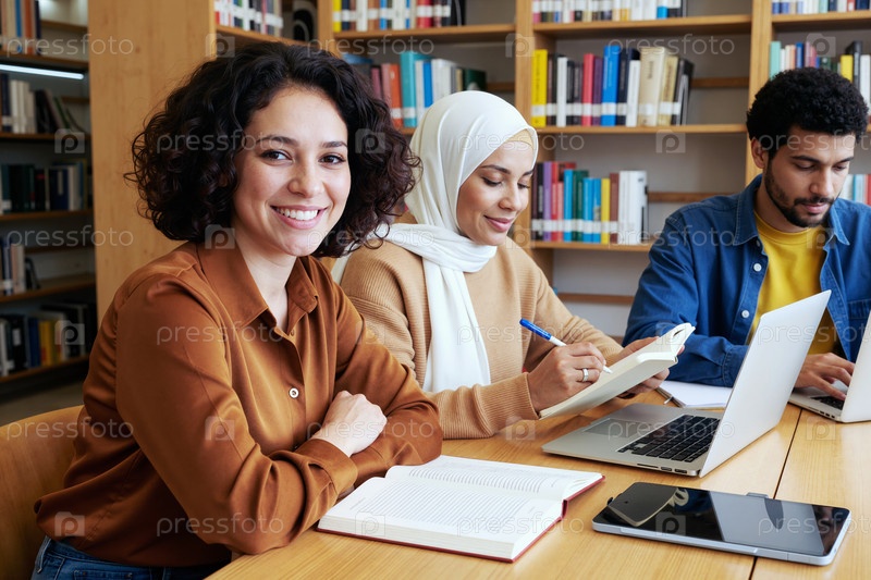 Портрет мультиэтнических молодых взрослых, изучающих вместе в библиотеке