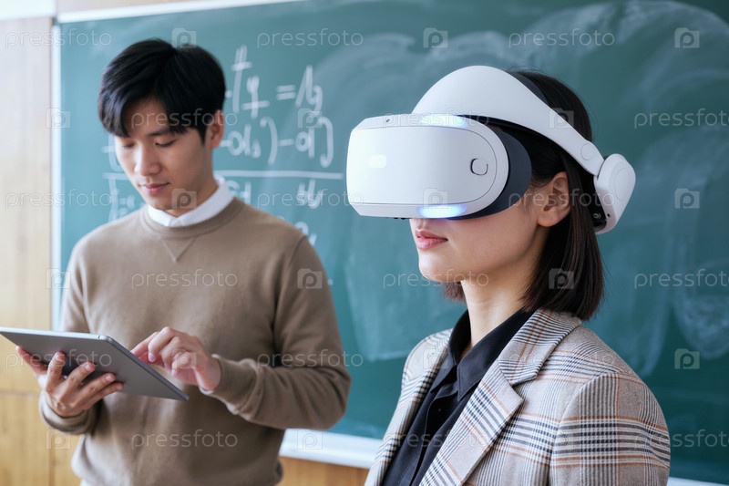 Молодая взрослая азиатская женщина испытывает виртуальную реальность рядом с Азиатским мужчиной, преподающим