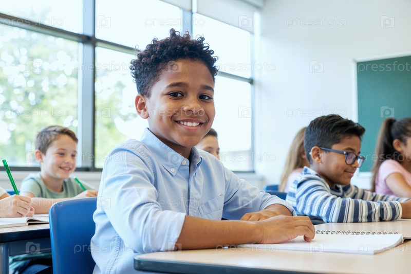 Портрет чернокожего мальчика, улыбающегося во время занятий с различными учениками