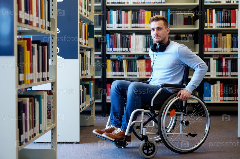 Молодой взрослый кавказский мужчина с инвалидностью, использующий инвалидный кресло в библиотеке