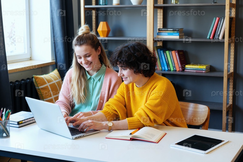 Две молодые взрослые белокожие женщины сотрудничают на ноутбуке в современной библиотеке