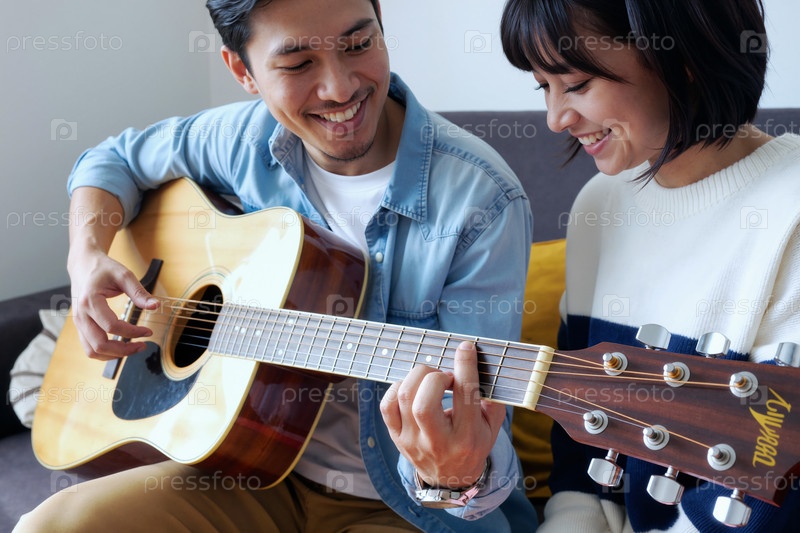 Молодой взрослый азиатский мужчина учит молодого взрослого азиатскую женщину играть на акустической гитаре