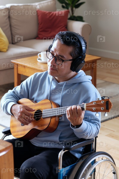 Среднего возраста азиатский мужчина с инвалидностью играет на укулеле, нося наушники