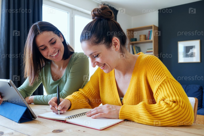 Две молодые взрослые белокожие женщины учатся вместе и делают заметки в помещении