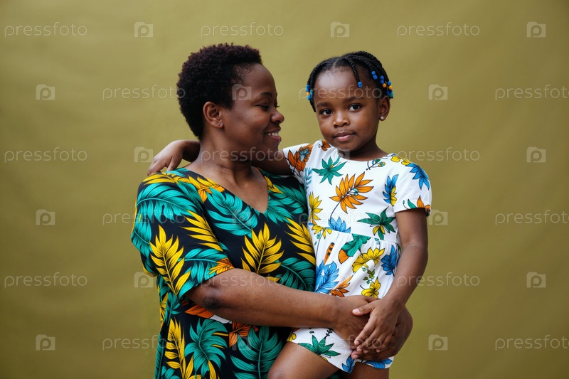 Черная женщина держит молодую черную девушку, улыбаясь на простом фоне