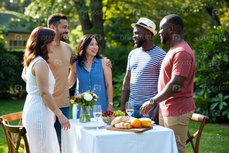 Группа разнообразных молодых взрослых, общающихся на открытом воздухе вокруг стола в саду
