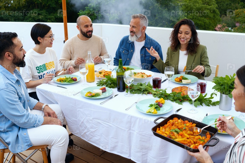 Разнообразная группа молодых взрослых и людей среднего возраста, которые вместе наслаждаются едой на свежем воздухе