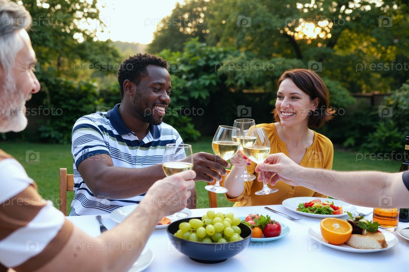 Мультиэтническая группа взрослых, выпивающих винные бокалы во время открытого собрания