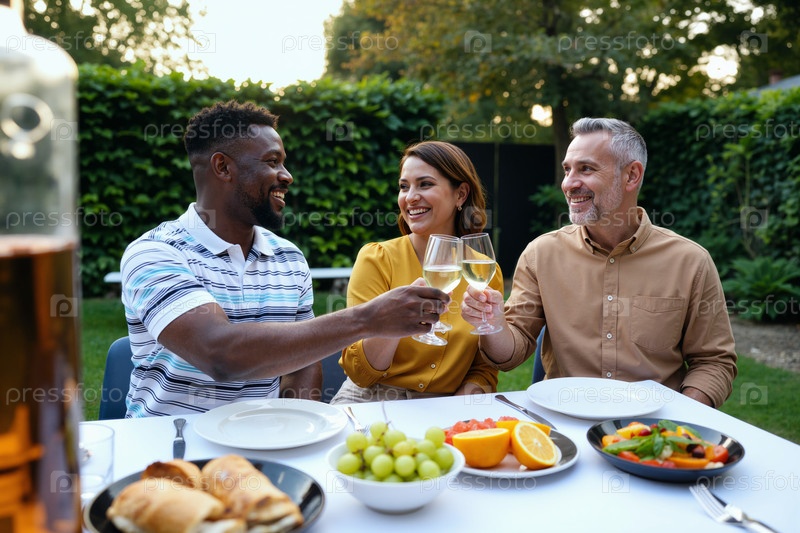 Мультиэтническая группа молодых и взрослых среднего возраста, тостирующих на открытом воздухе