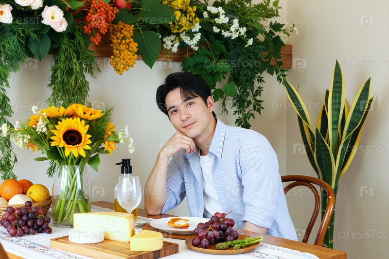 Портрет молодого взрослого азиатского мужчины, сидящего за столом и наслаждающегося сыром и фруктами