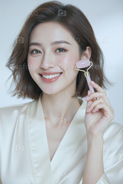 Портрет азиатской женщины, держащей ролик для ухода за кожей
