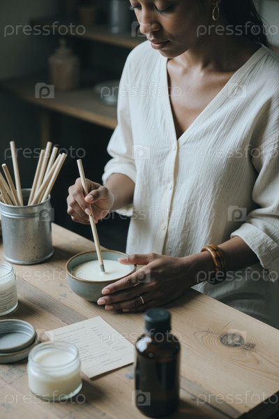 Черная женщина смешивает свечу воском для производства малого бизнеса
