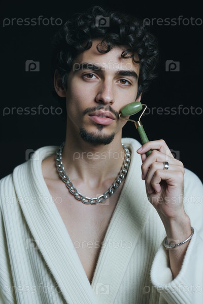Портрет взрослого мужчины, использующего нефритовый ролик для ухода за кожей