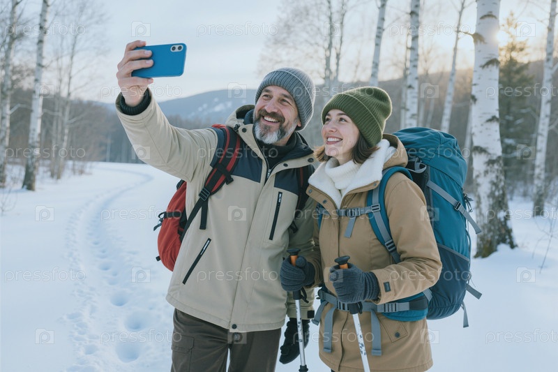 Пара в среднем возрасте делает селфи со смартфоном во время зимнего похода