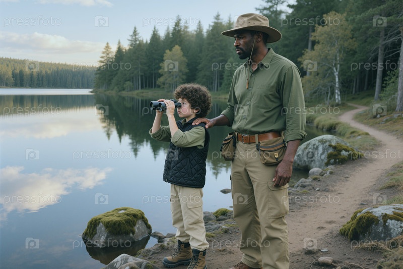 Чернокожий мужчина направляет мальчика на наблюдение за птицами у озера для образования в открытом воздухе
