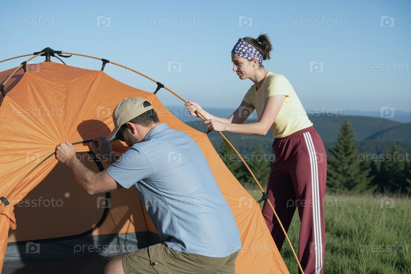 Собрание пары взрослых кемпинговой палаты во время выходных на природе