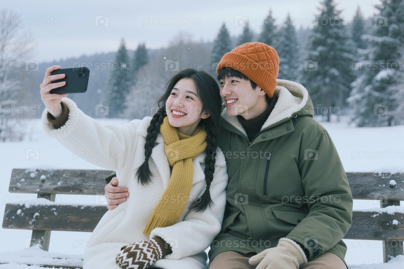 Азиатская взрослая пара делает селфи со смартфоном во время зимнего путешествия