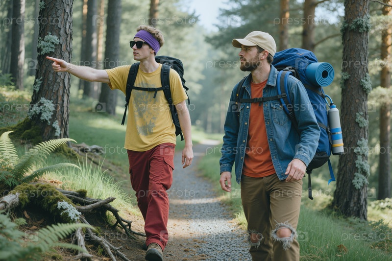 Взрослые мужчины, путешествующие по лесной тропе, планируют открытые приключения