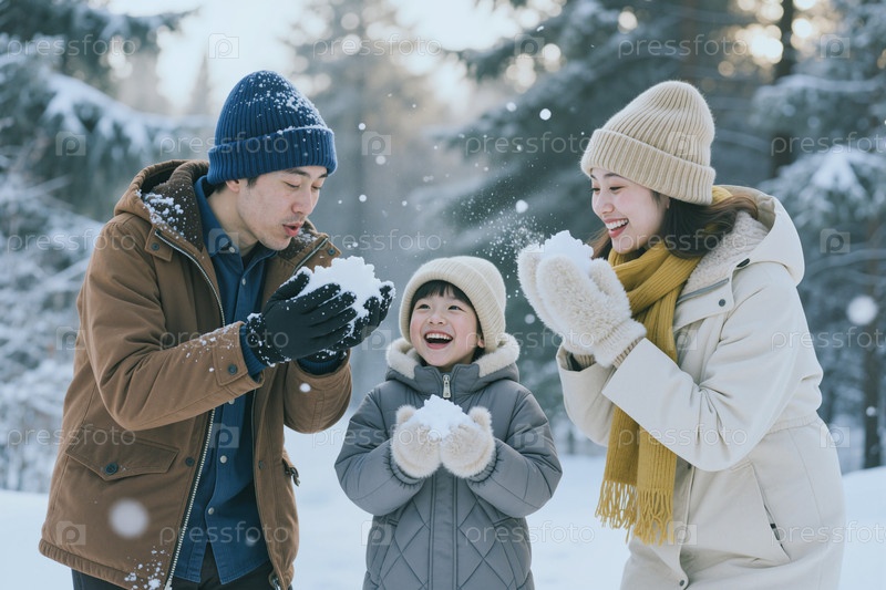 Семья, наслаждающаяся снежными играми для маркетинга зимнего путешествия в Азии