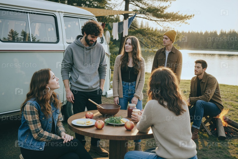Группа взрослых друзей, собирающихся на кемпинге для отдыха в открытом воздухе