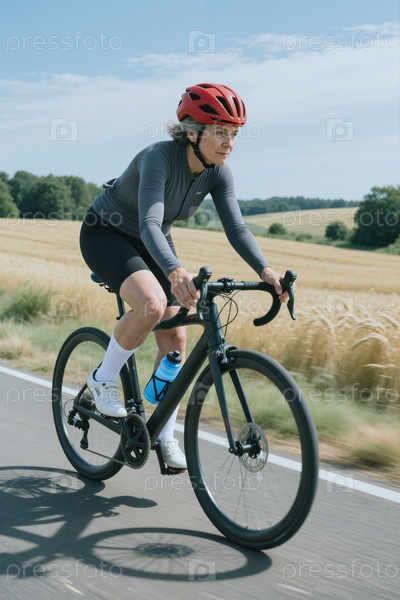 Женщина среднего возраста едет на велосипеде по сельской дороге для активного образа жизни