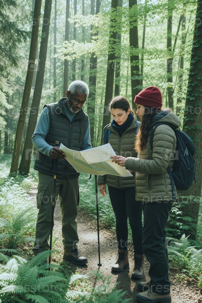 Старший чернокожий мужчина с взрослыми женщинами читают карту на лесном походе